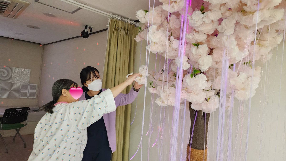 벚꽃나무와 은은하게 빛나는 광섬유를 손끝으로 천천히 만져보며 색과 촉감을 느끼는 시간을 가졌습니다.